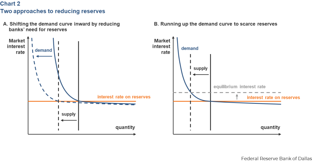 If we reduce banks’ need for reserves so that banks shift the demand curve inward, we’re still meeting banks’ demand. If we run up the demand curve and return to scarce reserves, we’re pushing up market rates relative to IORB and putting a price on reserves that banks don’t face today.